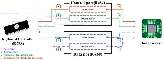 Keyboards are divided into PS/2 (Personal System/2) interface and USB (Universal Serial Bus) interface-based keyboards. In this article, a keyboard using the PS/2 interface was selected as the research object. The PS/2 interface is not used on desktops these days, but laptops connect the keyboard through the PS/2 interface. The keyboard data transfer process using the PS/2 interface is shown in Figure 1.