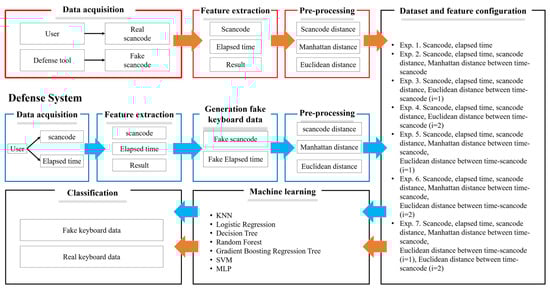 In the prior attack and defense system configuration diagrams shown in Figure 5, blue arrow represents the configuration of the defense system, and amber arrow represents the prior attack system. The attack system collects both the scan codes, which are the actual keyboard data inputted by the user and the random scan code generated by the security software. After configuring all the collected random and actual keyboard data into a dataset, the two data are classified using machine learning models to steal the actual keyboard data. To respond to these attacks, the defense system, like the attack system, requires a data collection step to utilize a machine learning model. This step is to collect data corresponding to the actual scan code and elapsed time, which is the keyboard data inputted by the user. Here, the purpose of collecting only data on scan code and elapsed time is to collect the same information to compare performance based on the same environment and data. Also, notably, the key features used in prior attack system are scan code and elapsed time.