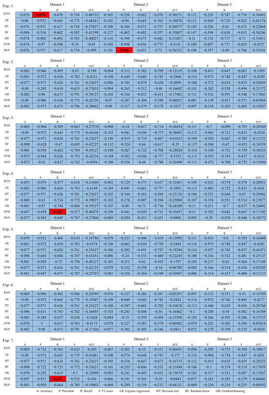 Analyzing the figure, the performance of the prior research and the proposed technique were individually compared, showing the results of performance increase or decrease according to the experiment for each dataset. The technique proposed in this article means effective defense if it decreases machine learning classification performance compared to prior researches. Therefore, compared to prior researches, area where performance decreased is expressed in blue, and conversely, areas where performance increased are expressed in red. Notably, the proposed technique was found to be most effective in Dataset 3, while Dataset 1 was found to be the least effective. In order to more intuitively show the above analysis results, the number of performance increase or decrease indicators according to the datasets and experiments is shown in Table 14.
