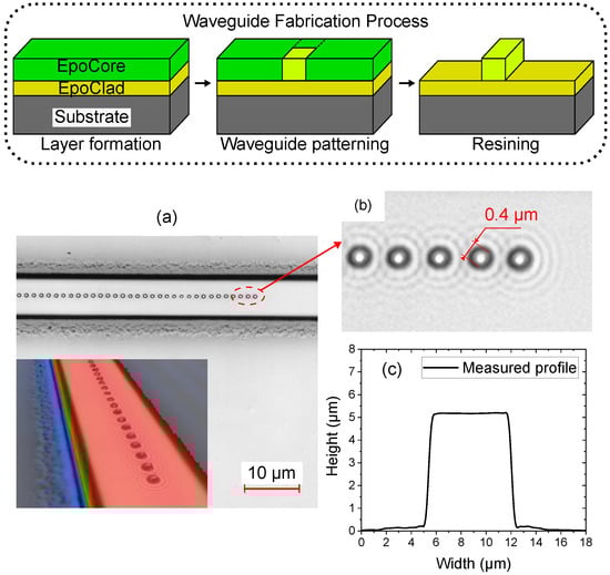 The fabrication process begins with an oxygen plasma treatment for the glass substrate to create a hydrophilic surface for optimal adhesion. After the oxygen treatment, a substrate layer for the waveguide, consisting of EpoClad2 from microresist technology GmbH, is deposited on the oxygen-activated surface of the substrate with a spin-coating process. The substrate polymer has a refractive index of 1.57 at 830 nm, which is lower than the polymer EpoCore5 (a refractive index of 1.58 at 830 nm) used for patterning the waveguide [20]. The substrate layer aims to ensure the optical confinement of the guided light in the waveguide that is applied on top of this substrate layer. The layer thickness of the polymers depends on the spin-coater speed, and here the substrate polymer is adjusted to 2 µm. After the spin-coating process, the glass substrate with the EpoClad2 layer was prebaked for 5 min at 120 °C. Subsequently, after applying flood exposure with UV light, the polymer substrate was hard-baked on a heat plate at 120 °C for 30 min. After the polymer substrate was prepared, its surface was again activated with oxygen plasma. Immediately after this, we added a 5 µm layer of EpoCore5 on top of it via spin coating. The substrate with both layers was then prebaked on a heat plate subsequently at 50 °C for 2 min and 90 °C for 4 min. Afterward, we applied a waveguide pattern by using a UV-photolithography machine (µPG 101, Heidelberg instruments, Heidelberg, Germany). Consequently, the substrate with patterned polymers was postbaked on the heat plate with the same parameters from prebake processes. Finally, the substrate with polymer layers was immersed in the developer (mrDev600, micro resist technology GmbH, Berlin, Germany) for 3 min to resin the remaining unexposed polymers. A final hard-bake process on the heat plate at 120 °C for 30 min concluded the fabrication process for the ridge waveguide, and thus the waveguide was then ready for Bragg grating inscription. Inside the dashed line area of Figure 1, a scheme of the fabrication process is displayed. The waveguide enlarged with a 100× objective and its cross-section profile measured with a laser scanning microscope (LSM) (VK-X250, Keyence Deutschland GmbH, Neu-Isenburg, Germany) is displayed in Figure 1c; the cross-section profile of the waveguide shows a dimension of 6.5 µm width and 5 µm height.