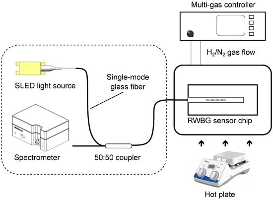 To evaluate the read-out signal of the RWBG, a broadband SLED with a center wavelength of 840 nm (EXS210006-01, EXALOS AG, Schlieren, Switzerland) was used as the light source, the emitted light beam was coupled through a 50:50 fiber coupler and transmitted into the RWBG, and finally, the back-reflected Bragg signal was coupled via the fiber coupler into a spectrometer (Flame-S-VIS-NIR, Ocean Insight). The optical measurement setup is illustrated in Figure 3 inside the dashed line area. As the RWBG sensor chip was connected only via a single glass fiber to the interrogator, the flexibility of handling the chip in different experimental setups was high. To test the sensor at different temperature conditions, the RWBG sensor chip was placed on a tunable hot plate (Fisherbrand Isotemp, Thermo Fisher Scientific GmbH, Dreieich, Germany). For the gas-phase hydrogen measurement, the sensor chip was enclosed in an experimental gas chamber with a connection to the gas flow controller system (647C, MKS Instruments GmbH, Munich, Germany) to adjust different concentrations of the gas mixtures.