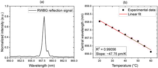 (a) Reflection spectrum of the RWBG. (b) Temperature-dependence-measurement result.
