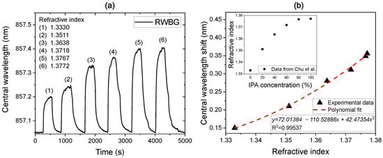 During the measurement, the monitored shift in the RWBG central wavelength increased noticeably; when the sensor surface was wetted with IPA solutions, the average sensor response time lied at 120 s. The RWBG central wavelength shifts depending on the refractive indexes of the different surrounding aqueous IPA solutions are displayed in Figure 5b; here, we adopted the refractive index of the corresponding IPA solutions from Chu et al. [27], which is additionally shown in the inset of Figure 5b. The overall sensor response during the measurement can be fitted with a polynomial function.
