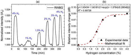 For a more detailed analysis, the experimental results are plotted in Figure 6b. The plotted measurement results reveal a nonlinear signal intensity shift with increasing hydrogen concentration. Especially at hydrogen concentrations between 1 and 2 vol%, the sensitivity is higher. At 4 vol% hydrogen content, the sensor sensitivity decreases, but the signal intensity shift remains noticeable. For higher hydrogen concentrations above 5 vol%, the sensor response is saturated and is unable to show a higher-intensity shift. The overall intensity changes can be fitted by using a nonlinear mathematical function. A similar nonlinear sensitivity characteristic was also reported in other works, and we assume that it is caused by the phase transition of the palladium nanoparticles [19,30]. Despite the nonlinear response, the RWBG sensor can still be used as a hydrogen indicator.