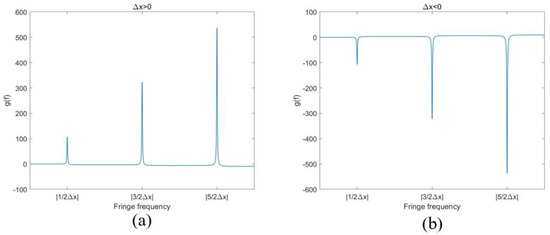 The even k is denoted as keven, the odd k as kodd. This function hits its extremums when . The interval of two adjacent extremums is , by which we can obtain f0. Figure 4 shows the ideal variation in when Δx > 0 or Δx < 0, and . Obviously, the valleys of are what we should detect when Δx > 0; the peaks of should be detected when Δx < 0. Figure 4 shows the curves with different Δx. Apparently, the local extremums of can be minimum and maximum while Δx is positive or negative. Then, it is not easy to decipher the sign of Δx from the extremums with a uniform threshold.