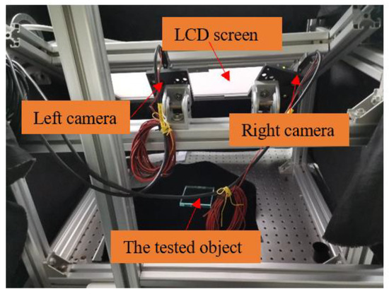 The experimental system consists of a 1680 1050 LCD monitor with a pixel pitch of 0.258 mm and a pair of 1360 1024 cameras with a pixel pitch of 4.65 . For the monocular PMD system, the height of the tested object causes ambiguity of the surface, so two cameras are used in the experiments [22]. The cameras’ focal lengths are both 12 mm. The left camera is the main field of view. The system setup is shown in Figure 7. And the system was calibrated [23].