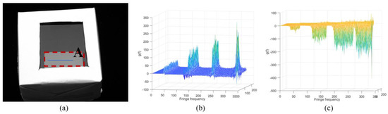 The x- and y-fringe patterns captured by the left camera at f = 0.0663 are shown in Figure 8. As shown in Figure 8, there are low contrast regions caused by parasitic reflection. As shown in Figure 9, region A is the main application area of the proposed method, which is framed with a red dotted line. The variation of in different directions on the blue line in region A is given. There are multiple peaks of function for two directions, as shown in Figure 9b,c. In order to illustrate that the proposed method successfully decouples the top surface information from the superposed patterns, the reconstructed result of the proposed method is compared with the reconstructed result of the traditional PMD method. The same unwrapping algorithm is used for the traditional PMD. The traditional PMD method reconstructed the top surface based on the phase of the highest fringe frequency. Figure 10a,c show the measurement results of the proposed method and traditional PMD, respectively. From the results, it can be clearly seen that the reconstructed error area of the traditional PMD method is mainly located in the A region, which directly illustrates the negative influence of parasitic reflection on the measurement accuracy of the traditional PMD method. The reconstructed results without low-order errors, i.e., removing a fitted plane, of the proposed method and traditional PMD are shown in Figure 10b,d, with , and , , respectively.