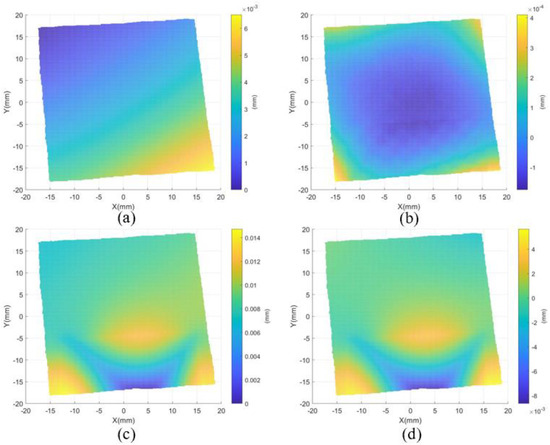 The reconstructed results. (a) Reconstructed top surface using the proposed method, (b) reconstructed result without the low−order errors using the method, (c) reconstructed top surface using traditional PMD, and (d) reconstructed result without the low−order errors using traditional PMD.