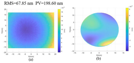 Further, the result measured by the interferometer is regarded as a standard value, where the PV and RMS values are 67.95 nm and 198.60 nm, respectively, as shown in Figure 11a. To further evaluate the measuring accuracy, the corresponding central circular regions are selected from the results of both the proposed method and the interferometry, which are shown in Figure 10b and Figure 11a, respectively. Then, the surface error is fitted by Zernike polynomials, and this is presented in Figure 11b. The PV value and RMSE of the error map with five terms removed are 0.14 μm and 0.02 μm.