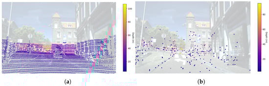 Comparison of a LiDAR point cloud (a) and 3+1D RADAR point cloud (b) projected to the image plane for an automotive scene of View of Delft dataset.