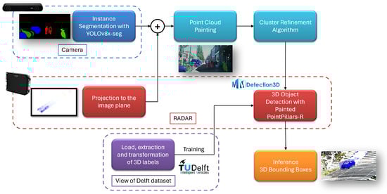 1] to perform 3D object detection based on painted automotive RADAR point clouds via segmented camera images. The method is composed of four stages: instance segmentation, point cloud painting, rule-based cluster refinement and 3D object detection. A diagram representing the whole pipeline is shown in