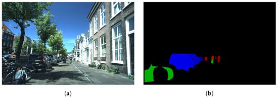 Monocular camera image (a) and instance map highlighting pedestrians, bicycles and cars (b) for frame 03456 in the View of Delft dataset.