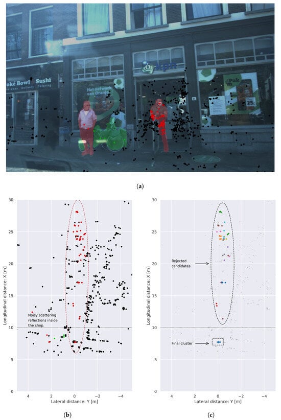 Figure 4. In this qualitative scenario, the smearing effect is present as a large set of reflections that range from 10 to 30 m, which is produced due to the effect of RADAR scattering and noisy propagation inside a shop. As a pedestrian is standing in front of the shop door and multiple reflections are lying behind in the same radial direction, various points are incorrectly assigned to this instance when the painting procedure is performed. Applying the cluster refinement algorithm, we can identify the blob of points that belong to the object and filter noise that is not propagated into the following stage of the system.