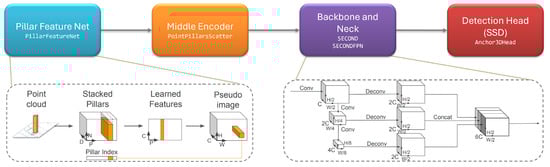 Figure 5 and is structured as follows: a data preprocessing module, which is responsible for voxelizing point clouds with a random sampling strategy to augment the training data; a Pillar Feature Net extracts features per pillar using the arithmetic mean of points and their offset from the center; a Middle Encoder converts learned features to a sparse pseudo-image, facilitating subsequent processing; then, the architecture comprises a backbone, neck, and head, following the typical scheme of a 2D object detection network. The backbone is a convolutional network, SECOND [