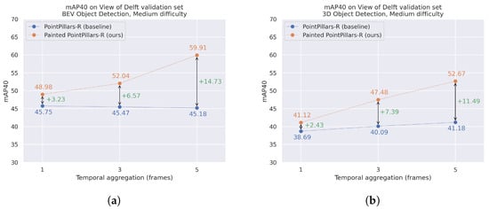 Comparison on Mean Average Precision (40 points) between PointPillars-R and Painted PointPillars-R over the View of Delft dataset validation set for bird’s eye view (a) and 3D object detection (b).