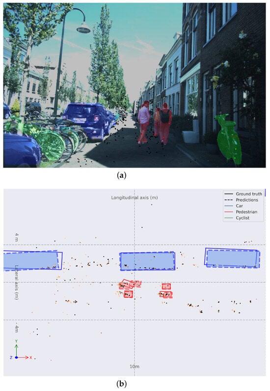 (a) Monocular image with colored instance map and RADAR point cloud projected. (b) Object detection in BEV space for frame 03970 with Painted PointPillars-R. Bounding boxes are: solid for ground truth and dashed and filled for predictions; red for Pedestrians, green for Cyclists, and blue for Cars. Older points are lighter orange and more recent points are darker orange.