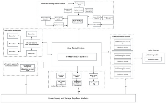 We conducted secondary development on the DW1000 chip and designed a UWB positioning system. Initially, hardware calibration and experimental environment setup were performed. Subsequently, measurement values were obtained by calculating the TDOA, and hyperbolic equations were constructed. The three-sided positioning method was employed to determine the initial values of the target UWB tag. UWB measurement data were collected, and the obtained data were input into the HFWF-BP neural network localization algorithm to locate the moving target and obtain UWB measurement values. By integrating geometric positioning, the optimal tracking results were obtained. The performance evaluation of the experiment was conducted through dynamic/static CDF analysis. On mobile IoT devices, the HFWF-BP neural network algorithm was utilized to compute the distance and angular deviation from the UWB tag to the center of the UWB base station. The PID algorithm was employed for adjustment to control the PWM value, thereby regulating the motion of the autonomously tracking mobile IoT device. In this research, we designed an articulated autonomous positioning and following mobile IoT device based on UWB technology, which encompasses four major systems: an autonomous following system, an automatic leveling control system, a mechanical arm system, and an ultrasonic obstacle avoidance system. The mobile IoT device utilizes a UWB module to design the autonomous following system, following the moving target through a configuration of three UWB base stations and one UWB tag. The mechanical arm and ultrasonic obstacle-avoidance systems are responsible for detecting and overcoming or circumventing obstacles encountered during the following process. The automatic leveling control system corrects the tilt angle while overcoming obstacles, achieving the automatic leveling function. In the overall framework of the positioning and following system depicted in Figure 1, the DecaWave DWM1000 chip was used for the positioning module [19]; the STM32F103ZET6 chip serves as the main control chip of the system [20]; the motor drive module utilizes the L298N chip produced by the SGS Company [21]; a voltage-stabilizing module ensures stable current for each module.