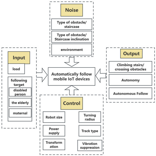 As illustrated in Figure 2, to delineate the design structure, we developed a Parameter Diagram for the autonomous positioning and following mobile IoT devices, which includes input, output, noise, and control components. The input consists of individuals who have difficulty moving, such as the elderly, disabled, and pregnant women, as well as items that meet the motor torque load requirements. The output is the capability to climb stairs, overcome obstacles, and control the carrying platform to maintain self-balance. Various noise factors and control elements must also be considered in practical tests.