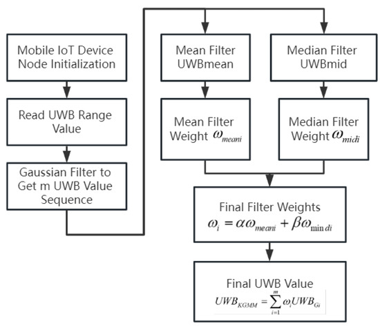 The singular application of filtering techniques does not yield optimal results in data processing [24]. Therefore, this research synthesizes the strengths and weaknesses of various filtering methods, combining Gaussian, mean, and median filters in a complementary manner to process UWB measurement data. This approach led to the development of a hybrid filtering weighting algorithm, the process of which is illustrated in Figure 3.