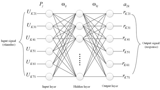 The number of neurons in the hidden layer can be determined by an empirical formula, which is lbT, where represents the number of neurons in the hidden layer, and T is the dimensionality of the training samples. Increasing the number of neurons in the hidden layer can enhance localization accuracy, but this comes at the cost of increased computational load. Considering both the efficiency and accuracy of the algorithm and after multiple rounds of experimentation, the number of nodes in the hidden layer of this network was established as seven. The transfer function for the hidden layer employs a Sigmoid function, , which accepts any value as the input and produces an output value that ranges between −1 and +1.