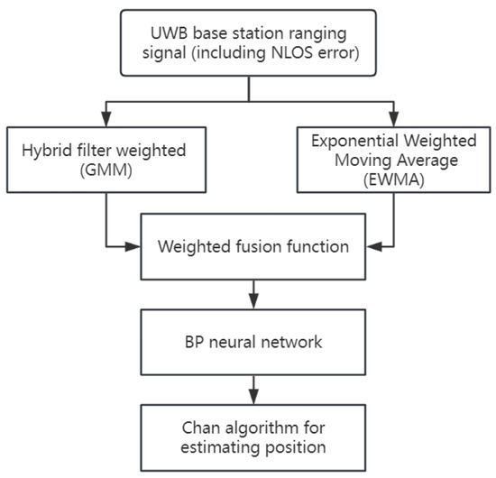 The Chan algorithm exhibits minimal error in TDOA measurements, particularly under the ideal conditions of zero-mean Gaussian random variables, where it achieves high localization accuracy. However, its performance is significantly affected in NLOS environments, where TDOA measurements are prone to more-significant errors [27]. By employing a WF-BP neural network to correct TDOA measurement data, the NLOS errors within TDOA measurements can be reduced, thereby effectively enhancing the localization accuracy when using the Chan algorithm for positioning. This study integrates the WF-BP neural network algorithm with weighted fusion, calculating the estimated values through the Chan algorithm, as illustrated in Figure 5.