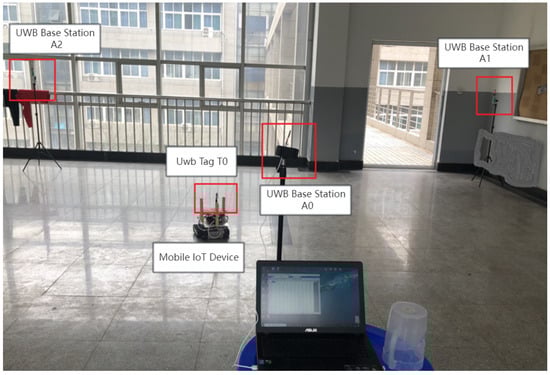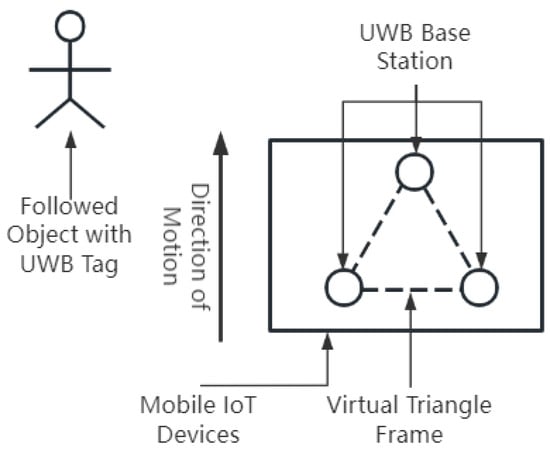 Utilizing the weighted fusion BP neural network algorithm proposed in this article, a more-accurate following trajectory is achieved in conjunction with geometric positioning techniques. Three DWM1000 sensors were strategically placed vertically, forming an equilateral triangle on the mobile IoT device and serving as positioning bases. These selected sensors were fixed at the apexes of an equilateral triangle. The human subject and the mobile IoT device operated in the same environment. An appropriate DWM1000 sensor was chosen to be worn by the individual being followed, functioning as a mobile UWB tag, as illustrated in Figure 6.