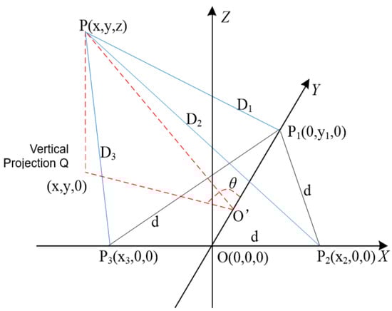 In the three-dimensional space, the mobile IoT device functions as a coordinate platform. Utilizing a set of fixed base stations arranged in an equilateral triangle as the reference system, the XYZ spatial Cartesian coordinate system is established. The midpoint of the side of the equilateral triangle is designated as the origin . The three vertices of the equilateral triangle serve as the coordinates, respectively. The coordinates of the tag worn by the object being tracked are denoted as . The direction of motion of the mobile IoT device is consistently aligned with the positive direction of the Y axis, as illustrated in Figure 7.
