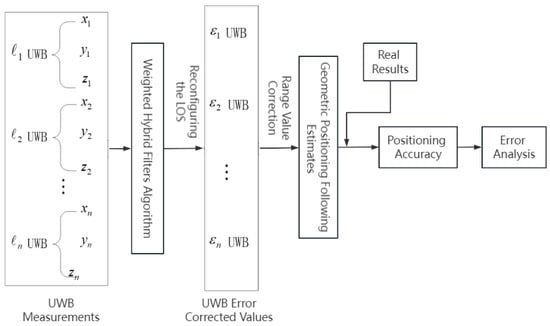 Step 5: Perform the following for and : , where . Let each UWB measurement be multiplied with the weights , after which, the sum is obtained to obtain the new weighted UWB measurements after correction.
