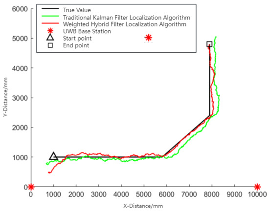 The hybrid filtering-weighted algorithm integrates the advantages of three distinct filtering methods, incorporating weights to eliminate outliers and smooth data by filtering edge values, ultimately yielding optimal positioning data. The proposed localization method in this article effectively suppresses interference in follow-up positioning caused by various factors, mitigating the jitter in UWB positioning data. The resulting UWB estimated values align more closely with the actual values, laying a solid foundation for subsequent integration with positioning and following algorithms and models.