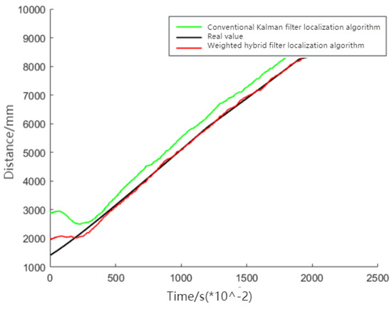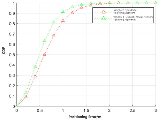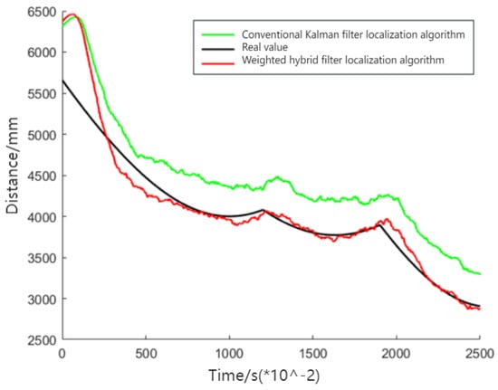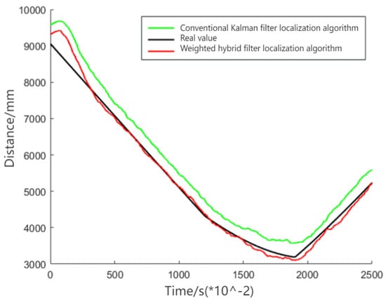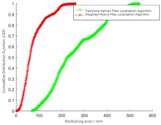 Figure 10 demonstrates that the weighted hybrid filtering algorithm yields positioning estimates closer to the actual values than the traditional Kalman filtering positioning algorithm. This is particularly evident in the analysis of distances to various base stations, as shown in Figure 11, Figure 12 and Figure 13. The Cumulative Distribution Function (CDF) value indicates the frequency of positioning values within a certain error margin; a higher CDF value suggests better positioning performance [28]. As depicted in Figure 14, at a positional error of approximately 20 cm, the CDF value for the traditional Kalman filtering positioning algorithm is 45%, whereas for the weighted hybrid filtering positioning algorithm, it is 93%. This indicates that the weighted hybrid filtering approach achieves more-accurate positioning estimates.