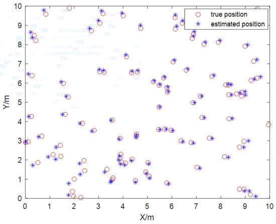 Under the same environmental conditions depicted in Figure 9, four base stations were arranged within a 7 × 10 m2 two-dimensional space, where NLOS errors were introduced. The positioning results, as corrected by the WF-BP neural network algorithm, demonstrated a significant improvement in rectifying the NLOS errors. This is evident from the enhanced alignment with the actual positions, as illustrated in Figure 19 and Figure 20.