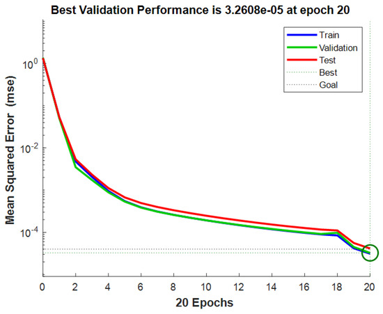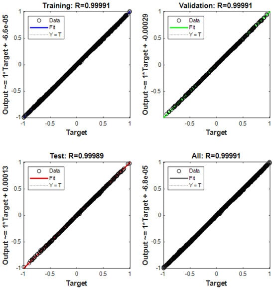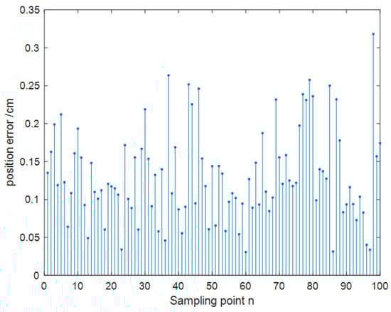 The collected dataset of 1000 samples was divided into two parts: 900 samples for training and 100 samples for testing. Through network training, it was determined that the optimal number of nodes in the hidden layer was 7. The maximum number of iterations was set to 100, with a learning rate of 0.1. Predictions were made on 100 test data sets. Figure 15 shows that the training predictions for the localization results were conducted in a 10 × 10 m² two-dimensional space. The network convergence trend, depicted in Figure 16, indicates that convergence occurred at the 20th step. As illustrated in Figure 17, the prediction error of the localization results reveals that, upon this convergence, the input of any 100 sets of TDOA values resulted in a localization error of less than 0.15 cm in 95% of the cases. The regression analysis results, shown in Figure 18, demonstrate that the correlation coefficients (R) for the training set, validation set, test set, and the entire dataset were all greater than 0.99, indicating a good fit for the model.