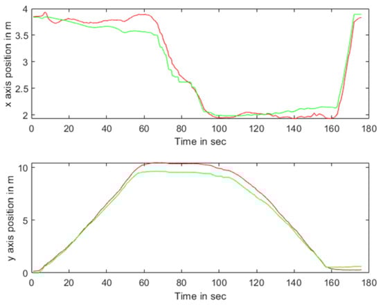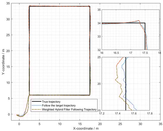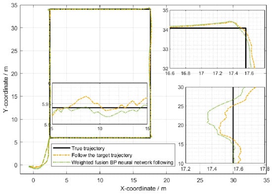 In the indoor setting, the following UWB tag and UWB base stations formed an equilateral triangle, with the straight-line distance between the center of this triangle and the UWB tag set at 1 m. The three base stations were positioned at a mutual distance of 0.3 m from each other. Both the individual carrying the mobile UWB tag and the mobile following IoT device were equipped with separate UWB positioning tags. Several UWB base stations were uniformly distributed within the indoor environment. The individual with the mobile tag moved at a walking speed (approximately 5 km/h), and his/her position and that of the additional tag were determined through the base stations distributed across the experimental site. The movement trajectories of the individual carrying the mobile tag and the mobile following IoT device are illustrated in Figure 21. The WF-BP neural network proposed in this paper was employed to analyze the moving targets, with the following trajectories depicted in Figure 22 and Figure 23.
