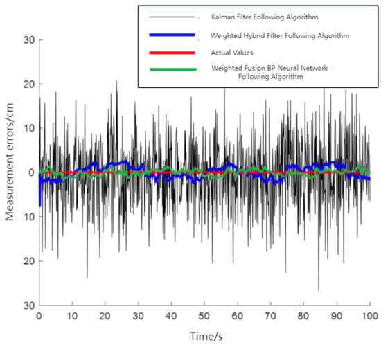 As observed in Figure 25, the traditional Kalman filtering following algorithm demonstrated that most range estimation errors were concentrated around 8 cm. This included disturbances such as UWB jitter values and systematic errors. In contrast, the WF-BP neural network following algorithm showed that most of the measurement estimation errors were centered at 4 cm. Moreover, these errors were relatively more stable, better fulfilling the practical requirements for accurate positioning and tracking.