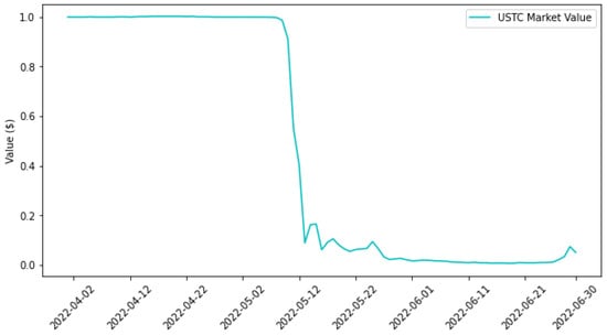 The crypto world witnessed a significant event in May 2022 with the collapse of the Unified Stablecoin (USTC) ecosystem. USTC, a decentralized finance (DeFi) platform, aimed to establish a stablecoin pegged to the US dollar. Despite its well-thought-out design and the backing of a diverse cryptocurrency basket, the platform faced an unexpected downturn, initiating a precipitous decline on 7 May 2022 and culminating in a near-zero valuation on 11 May 2022, as illustrated in Figure 1 [1,2].