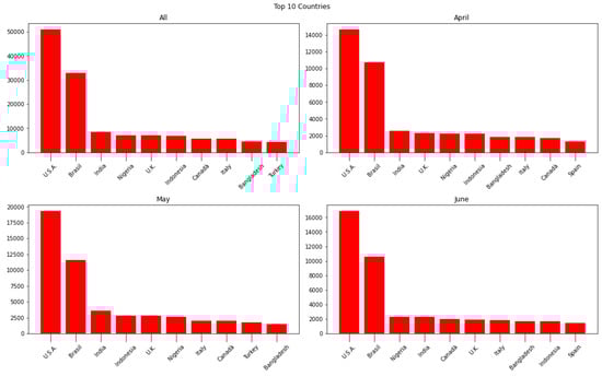 Figure 2 displays the top ten countries from which tweets were generated. At first glance, it might be surprising that South Korea is not listed among the top locations, given that the creators of Terra were based there. However, this can be explained by the fact that only a small percentage of people in South Korea use Twitter. Brazil stands out as one of the countries with the largest number of tweets. This was expected, considering that, at the time, Latin America ranked as the seventh-largest cryptocurrency market.