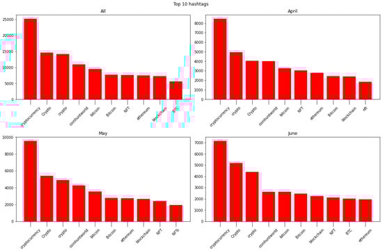 In Figure 3, we present the top 10 hashtags utilized in conversations across various periods: the entire dataset and the individual months of April, May, and June. It is evident that the hashtags remain largely consistent, with some minor variations in their ranking. Additionally, the volume of tweets associated with these hashtags exhibits a comparable pattern, indicating a consistent usage trend over time. This observation underscores the persistence and stability of hashtag usage across the dataset, with only marginal fluctuations in their relative popularity.