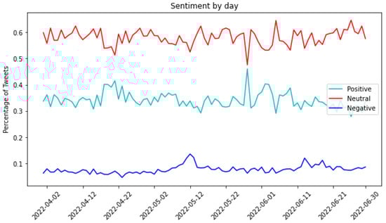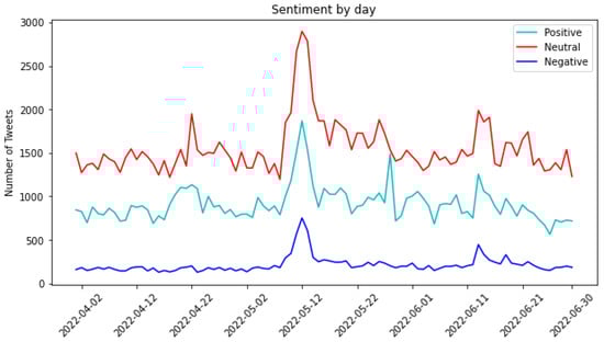 Figure 4 illustrates the sentiment classification of tweets grouped by day. In terms of absolute numbers, the count of neutral tweets consistently exceeded that of positive tweets, which, in turn, exceeded negative ones. On 8 May, the genuine collapse was triggered, reaching its climax on Black Wednesday, 12 May (indicated by spikes in the graph), when the entire Terra ecosystem faced significant challenges. Notably, on 12 May 2022, there was a surge in positive tweets. Surprisingly, individuals posted significantly more positive tweets than negative ones. This could be attributed to efforts to calm the market, preventing an impending crisis. Alternatively, there may have been excitement surrounding the collapse of the cryptocurrency, sparking surprise and curiosity.