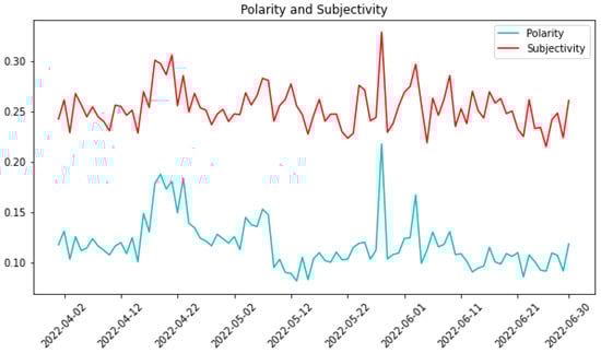 Figure 6 illustrates the dynamics of polarity and subjectivity values extracted from the analyzed tweets. The parallel trends observed in the two lines indicate that individuals tend to convey highly subjective content in their tweets. The most noteworthy spike occurred on 28 May, coinciding with the launch of the new Terra blockchain. This significant surge in both polarity and subjectivity values suggests a distinct shift in the sentiment expressed in tweets on that particular day. The heightened subjectivity implies that tweets during this period were notably opinionated, while the elevated polarity suggests a notable shift toward either positive or negative sentiments.