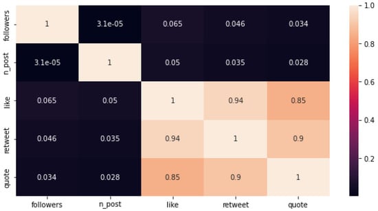 Supporting the notion that opinion leaders and followers are not necessarily intertwined, Figure 7 illustrates the correlation among the key metrics characterizing Twitter users and their posts. A notable finding emerges concerning the correlation between the number of followers and interactions with posted tweets. Contrary to the assumption that a larger follower count invariably leads to more engagement, this is not always the case. Users with a modest following might experience greater interaction with their tweets than those with a substantial following. This underscores that the substance and relevance of the content play a pivotal role in driving engagement, surpassing the significance of the follower count alone.