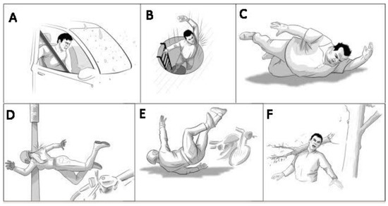 Different accidental occurrences of BPIs: (A) car accident, (B) dropping from a height, (C) obese human falling down, (D) high-speed bike accident and pole collision, (E) bike accident on the road, and (F) heavy object hit on shoulder.