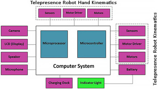 The concept of telepresence robots revolves around extending a person’s ability to participate in distant environments virtually [40]. These robots are employed in various sectors, including healthcare [41], education [42], business [43], and social interactions [44]. In healthcare, for instance, they enable doctors to interact with patients in remote locations. The major components of a telepresence robot are the following: