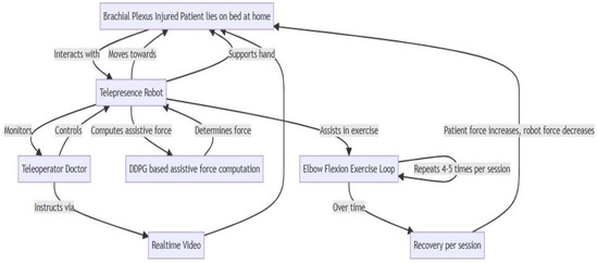 Telepresence robots equipped with robotic arms integrated with sensors are a cutting-edge technology for rehabilitation exercises, especially for elbow flexion in patients with upper limb impairments such as BPIs. A flowchart of the principles governing the operation of a telepresence robot arm for assisting in elbow flexion exercises is shown in Figure 5.