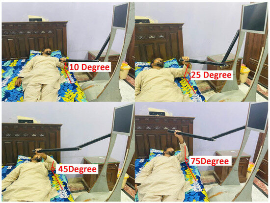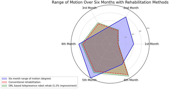 The ROM is an important parameter to evaluate the functionality and flexibility of a patient’s elbow joint. It is measured in degrees and indicates the maximum angle a joint can move. A normal elbow ROM varies from 0 degrees of extension to 150 degrees of flexion, as shown in Figure 13, depicting a visual comparison of two different rehabilitation methods over a six-month period. The blue area represents the general approximate range of motion, plotted across six distinct time points. The red dashed line indicates the progress typically seen with conventional rehabilitation techniques, providing a baseline for improvement. Most notably, the green dotted line illustrates the results of a DRL-based telepresence robot rehabilitation program, which demonstrates a consistent 5.2% improvement in the range of motion compared to conventional methods. These data suggest that integrating advanced DRL-based telepresence technology into rehabilitation practices could potentially lead to enhanced recovery outcomes for patients.