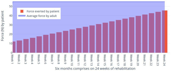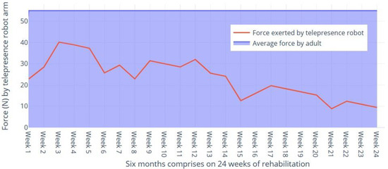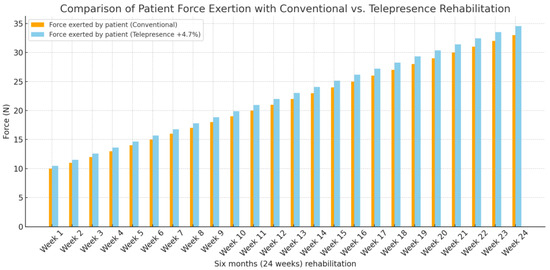 Figure 12 delineates a comparative analysis of patient force exertion over a six-month rehabilitation period, contrasting traditional methods with a telepresence robot-assisted approach. The visualization demonstrates a 4.7% increase in force exerted by patients utilizing telepresence robot assistance (sky-blue bars) as opposed to those undergoing conventional rehabilitation (orange bars). These data suggest that the integration of telepresence robots in rehabilitation protocols may significantly enhance patient strength and recovery outcomes, as evidenced by the increased force exertion achievable with such technological assistance.