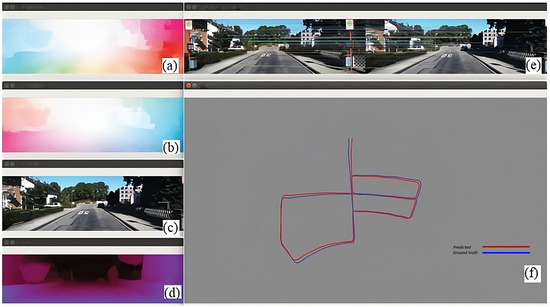 Images in the left column, arranged vertically, are as follows: (a) optical flow map in forward order, (b) optical flow map in reverse order, (c) points of instantaneous optical flow superimposed on the original image, (d) map showing monocular depth, (e) map illustrating the matching of key points in a pair of images, and (f) map depicting the reconstructed trajectory, where the estimated path is indicated by a blue line [51].