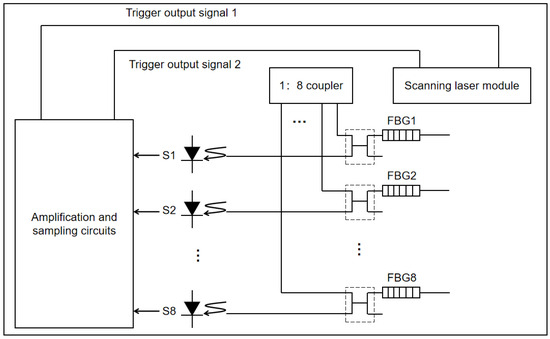 As shown in Figure 4, a scanning laser module can output multiple optical signals by utilizing a 1:8 optical splitter. Each optical signal can be connected to multiple FBG sensors with different center wavelengths. The scanning light source module operates in the C-band, scanning from 1528 nm to 1568 nm with a step size of 1 GHz or 8 pm in a periodic and rapid manner. The amplification and sampling circuitry, synchronized with the trigger output signal of the scanning tunable laser, can calculate the reflected wavelength of each individual FBG sensor in real-time, enabling demodulation.