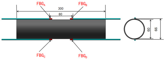 The experimental specimen used in the study was a resin-based carbon fiber composite tube with an inner diameter of 60 mm, an outer diameter of 66 mm, and a length of 300 mm. The tube was fabricated through roll molding, and the layup configuration was . Prior to the experiment, the surface of the carbon fiber tube was cleaned with alcohol, and UV shadowless adhesive was used to affix the FBG sensors onto the tube’s surface. The condition of the FBG sensors was verified after the attachment process, and the four sensors were systematically placed around the experimental region. The positioning of the sensors is illustrated in Figure 5.