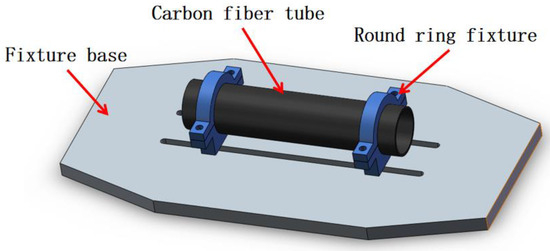 Considering the unavailability of a suitable fixture for the drop hammer impact tester, a custom test fixture was designed and fabricated specifically for the carbon fiber composite tube structure. The schematic diagram of the fixture clamping device is depicted in Figure 6. The carbon fiber composite tube specimen is securely held in place by rings and bolts at both ends of the fixture. During the low-velocity impact test, the specimen remains stable without any movement or overturning. Additionally, there is a defined gap between the specimen and the base of the fixture, ensuring that the specimen does not collide with the fixture’s base.