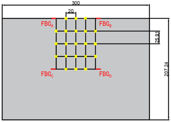 The initial point index n = 1 of the response signal is changed to n = 100 with an increment of Δ = 1. At each moment, the error between the reference signal SRef.(n,i) and the random test signal STest(i) is calculated point by point. The magnitude of the calculated error is compared to a predefined threshold to determine the magnitude of outliers at the 21 points in the grid. This process is repeated for the response signals acquired by the four FBG sensors used in the test. The outlier size for each location is determined by summing the outliers for each location, monitored by all FBG sensors. To determine the location with the least outliers, a minimum of three locations is required. The predicted locations are calculated using Equations (8) and (9), where n represents the number of selected positions, represents the size of the outlier at the corresponding position, represents the x-coordinate of the corresponding position, and represents the y-coordinate of the corresponding position, as follows: